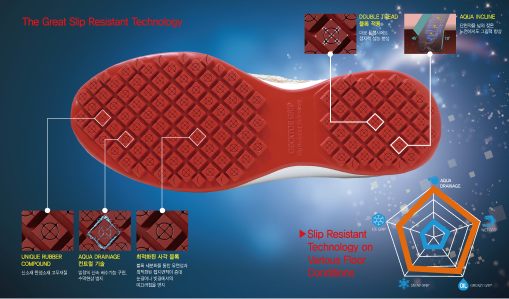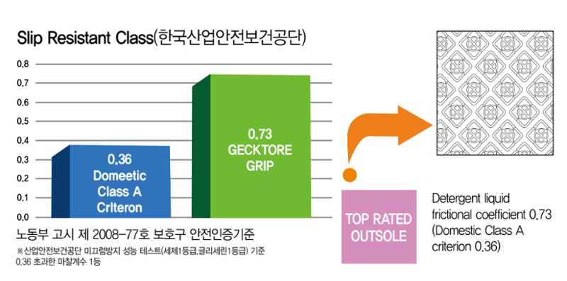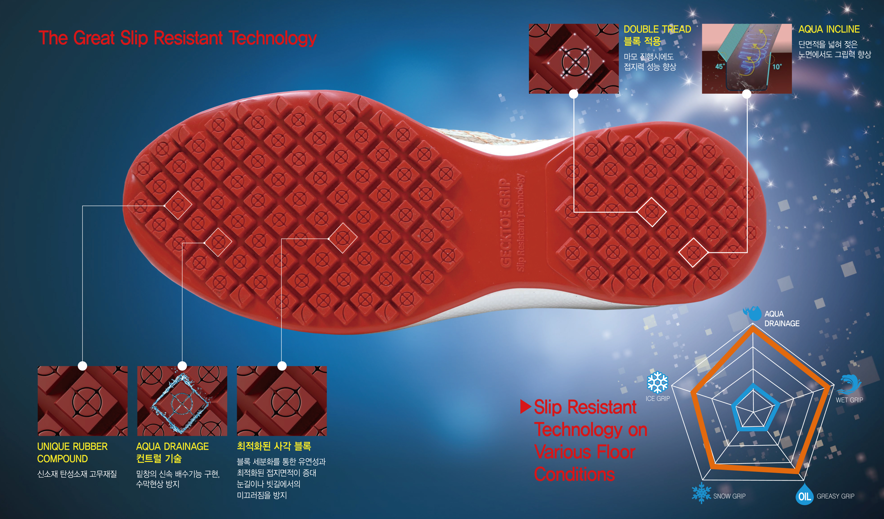 • 특수한 외부 환경에서도 매우 우수한 미끄럼방지 성능을 나타내어 안정성이 뛰어나게 함