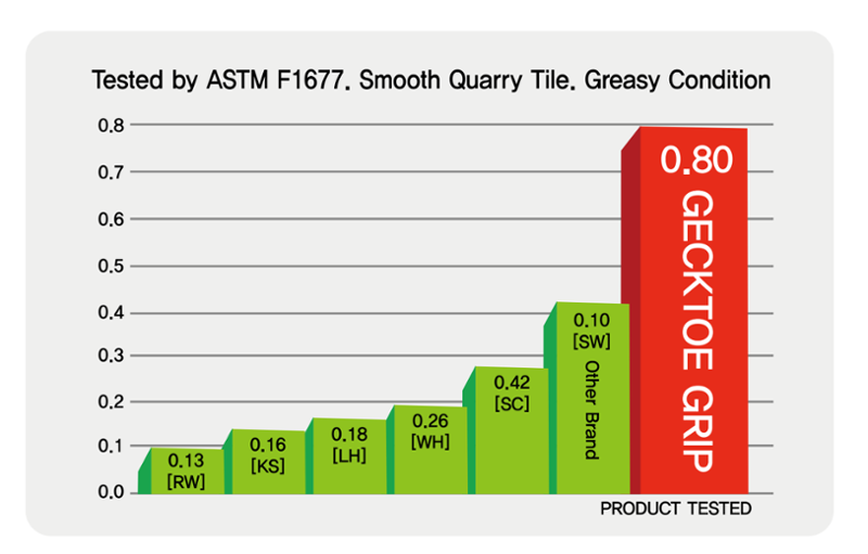 Year after year, GECKTOE GRIP footwear far exceeds the most stringent worldwide standards in slip resistance.